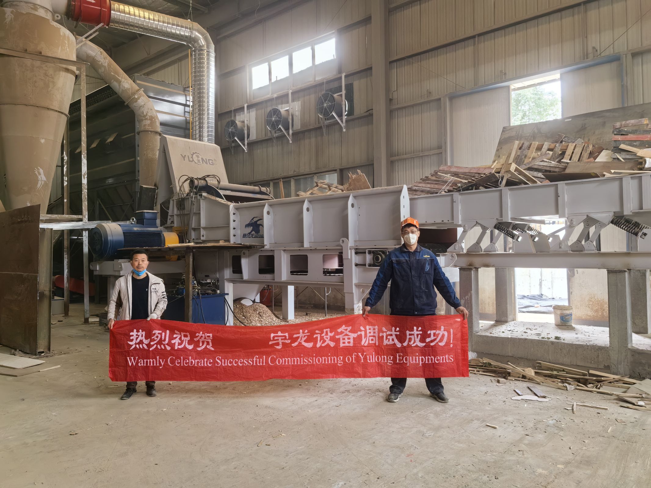 此客户购买了由宇龙公司自主研发设计并生产的暴风龙破碎粉碎一体机。本机型号为TR-C90150。客户用此设备破碎粉碎废旧木托盘和杂木。在此案例中我们根据客户原材料的特征为客户匹配了振动输送机,把杂乱无规律叠放的托盘料通过振动后更加均匀排布送至链板输送机,链板输送配合液压上喂料辊强制喂料将物料送入机器内部进行破碎粉碎。物料破碎后通过两道除铁装置将原料中所含金属排出,物料由风机抽入旋风分离器,在分离空气和物料后,物料从旋风分离器底部落下,空气通过旋风分离器顶部直接进入布袋除尘器进行最后一步的除尘。